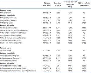 La práctica totalidad de los productos añade aditivos con poder antioxidante o conservante, dentro del grupo de fosfatos y derivados (tabla 1). Tan solo en un caso (Pescaburguers Pescanova) se añade solamente un aditivo fosfórico como potenciador del sabor, lo que en principio supone un menor aporte de fósforo, ya que este tipo de aditivos lo contiene en menor cantidad.