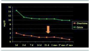 En nuestro caso, coinciden distintas formas de afectación renal. Por una parte, la mejoría del filtrado glomerular, junto con los niveles de calcio, sugieren la existencia de vasoconstricción renal por hipercalcemia como causa, al menos en parte, del FRA. Mientras que la NIG explicaría el deterioro de la función renal que permanece tras lograr la normocalcemia.
