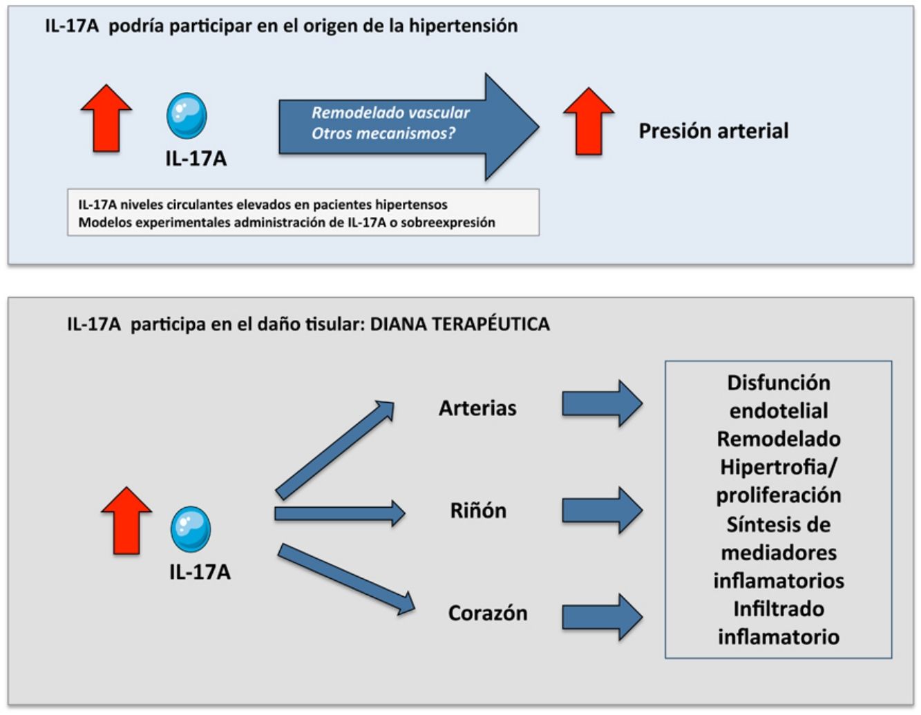 La interleuquina 17A (IL-17A) es una citoquina proinflamatoria producida por células del sistema inmune, sobre todo por los linfocitos Th17 y los linfocitos γδ. En este trabajo, revisamos el papel de IL-17A en la patogenia de la hipertensión y de la lesión en órganos diana. Estudios en ratones han demostrado que la IL-17A aumenta la presión arterial, probablemente por acciones a varios niveles. Además, las concentraciones plasmáticas de IL-17A están ya aumentadas en pacientes con hipertensión arterial ligera o moderada. Estudios preclínicos sobre hipertensión arterial han detectado células productoras de IL-17A en órganos diana, como corazón, vasos y riñón. En pacientes con nefroesclerosis hipertensiva existe infiltración del riñón por linfocitos Th17 y linfocitos γδ que expresan IL-17A. Además, en modelos experimentales de hipertensión el bloqueo de IL-17A, mediante estrategias génicas, o utilizando anticuerpos neutralizantes, disminuye la presión arterial por acciones sobre la pared vascular y el transporte tubular de sodio y disminuye la lesión en órganos diana. En conjunto, los datos presentados en esta revisión sugieren que la IL-17A participa en la regulación de la presión arterial y en la génesis y mantenimiento de la hipertensión arterial, pudiendo constituir una diana terapéutica en el futuro.