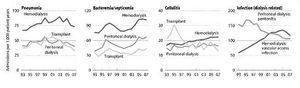 Aunque la incidencia de infecciones globales es similar para pacientes en ambas técnicas3, y siendo la tasa de ingresos globales por cualquier causa también similar, en el USRDS40 la hospitalización por infección es superior en el caso de HD, así como el tipo de infección, siendo éstas más graves (fig 2 y 3). La hospitalización por septicemia asociada a HD y trasplante es mayor que la asociada a DP. La tasa de ingreso hospitalario por neumonía son 79-89% mayor en pacientes en HD que en DP o trasplante40-41.