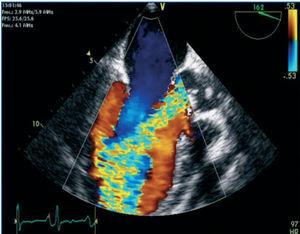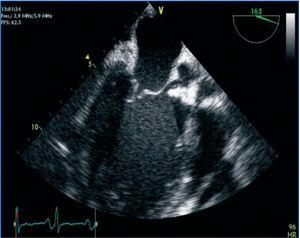 A cardiac ultrasound was performed, showing massive aortic regurgitation (AR) with a preserved left ventricular ejection fraction (LVEF) (69%). Three vegetations were found in the aortic valve, and the largest one measured 20mm. A pericardial haemorrhage was also observed without signs of heart block or thrombi (Figures 1 and 2).