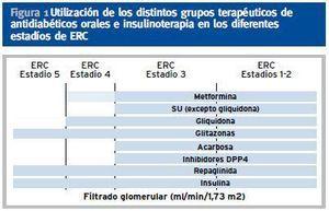 En caso de ERC con aclaramiento de creatinina < 30-60 ml/min/m2 se puede usar la combinación de repaglinida (que mejora la secreción de insulina, en caso de que persista reserva insulínica) con glitazona (que mejora la sensibilidad a la insulina). En la tabla 3 aparecen las indicaciones y contraindicaciones de los distintos grupos de ADOS en diferentes estadíos de ERC (figura 1).