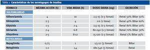 Son fármacos capaces de estimular a las células β para que aumenten su secreción endógena de insulina. Pueden estimular directamente la secreción de insulina o aumentar su respuesta secretora frente a nutrientes como la glucosa. Existen dos clases de secretagogos de insulina: sulfonilureas y meglitinidas. Las sulfonilureas están contraindicadas en caso de insuficiencia renal moderada, excepto la gliquidona que por su eliminación biliar puede usarse en caso de enfermedad renal crónica con aclaramiento de creatinina < 50-60 ml/min/m2. Sus principales efectos secundarios son las hipoglucemias y el aumento de peso. La eliminación de repaglinida es principalmente biliar, lo que puede hacerla útil en cualquier estadío de ERC, debiéndose administrar antes de las comidas principales. En la tabla 1 aparecen los principales secretagogos.