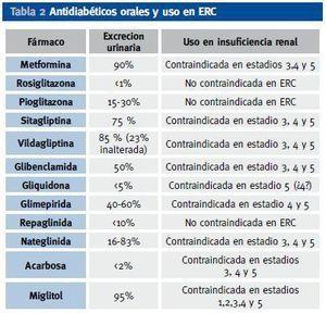 De acuerdo con el Consenso de 20083, se debe iniciar desde el momento del diagnóstico, junto a las modificaciones del estilo de vida, el tratamiento con metformina, pero esta biguanida clásicamente está contraindicada en los estadíos 3,4 y 5 de ERC (contraindicación por riesgo de acidosis láctica si creatinina ≥ 1,5 mg/dl en hombres o creatinina ≥ 1,4 mg/dl en mujeres o si aclaramiento de creatinina < 60 ml/min/m2). En recientes trabajos se considera que su uso es seguro en caso de aclaramientos de creatinina > 30 ml/min/m2, por lo que la podríamos usar en el estadío 3 de ERC5. En la actualidad se está replanteando algunas de las contraindicaciones del uso de metformina, debido a la baja incidencia de acidosis láctica, a pesar de no respetarse en ocasiones las contraindicaciones para su utilización y al gran número de pacientes a los que se les prescribe6.