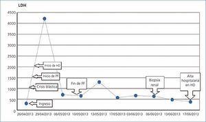 Al día siguiente al traslado se realiza analítica de control que evidencia 8290 leucocitos, Hb 11 g/dl, plaquetas 20 000/l, urea 59 mg/dl y Crp 2,3 mg/dl. Se realiza nuevo frotis de sangre periférica en el que se detecta una población patológica de células inmaduras de aspecto mieloide con intensa granulación. Algunas de ellas con núcleo hendido «en hachazo», eritroblastosis con promielocitos atípicos. Compatible con leucemia mieloblástica aguda probablemente promielocítica, posteriormente se realiza mielograma que confirma el infiltrado de células promielocíticas con un estudio citogenético que confirma la translocación (t15;17). Ese mismo día, somos consultados debido a que el paciente presentó por la noche un cuadro de dolor abdominal brusco, centrado a nivel lumbar, con oligoanuria; se revisa el frotis de sangre periférica en el que se detectan esquistocitosis significativa en torno al 8 %. Este contexto hace muy posible el diagnóstico de microangiopatía trombótica. El mismo 27 de abril de 2013 se realiza una tomografía axial computarizada (TAC) abdominal que muestra defecto de perfusión a nivel de la corteza renal bilateral, con arteria y vena renales permeables, compatible con necrosis cortical. Igualmente se realiza gammagrafía renal que es orientativa de necrosis cortical. En la analítica practicada 6 h más tarde ya presentaba un sedimento con microhematuria y proteinuria de 100 mg/dl, una analítica con Crp de 4,6 mg/dl, con ligera elevación de enzimas hepáticas con proteína C reactiva (PCR) ultrasensible de 165 mg/l, bilirrubina total 5,9 mg/dl, con coagulación (dímero-D 36 mg/l, actividad de protrombina 53 %, resto normal), test de Coombs directo e indirecto normal, por lo que, ante la alta sospecha clínica de síndrome hemolítico urémico (SHU), se inicia tratamiento con plasmaféresis diaria con 5 litros de plasma fresco congelado (1,5 volúmenes plasmáticos), junto a terapia hipotensora, dada la elevación progresiva de las cifras tensionales: 120/70 a 170/90 mmHg. Al día siguiente el paciente permanecía en oliguria con una Crp de 7 mg/dl y cifras tensionales elevadas (160/80 mmHg), por lo que se inicia hemodiálisis (primera sesión: 28 de abril de 2013). Se realizan un total de 12 sesiones de plasmaféresis (7 consecutivas y 5 a días alternos), hasta desaparecer los datos de hemólisis (descenso de lactato deshidrogensa [LDH], bilirrubina indirecta y esquistocitos [figura 1], junto al aumento de haptoglobina: mg/dl [70 (1 de mayo de 2013) a 75 (13 de mayo de 2013) a 217 (17 de junio de 2013)], y plaquetas). El 1 de mayo de 2013, al finalizar la quinta sesión de plasmaféresis, el paciente presenta un cuadro de insuficiencia respiratoria severa junto a leve hemoptisis y disminución del nivel de conciencia, por lo que pasa a la unidad de cuidados intensivos (UCI), donde continúa con plasmaféresis y hemodiálisis. En la UCI es necesaria la ventilación mecánica y se practica una gammagrafía pulmonar por la sospecha de infartos pulmonares que no evidencia datos de tromboembolismo pulmonar; también se practica TAC craneal que descarta infartos cerebrales. Finalmente, el paciente sale de la UCI cuatro días más tarde con respiración espontánea con una infección respiratoria por Acinetobacter y Pseudomona aeruginosa e infección urinaria por Acinetobacter baumanii. La respuesta clínica a la quimioterapia con ATRA más idarurrubicina es satisfactoria y presenta una buena respuesta al tratamiento, siendo dado de alta por hematología el 18 de junio de 2013 con revisiones en consultas externas.
