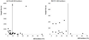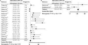We verified that the meta-analysis of AKI overall and ICU incidence presented high heterogeneity and, possible causes for this may be related to recognized differences among the studies, especially, with regard to design, number of included participants and follow-up time. The number of enrolled patients varied between 16 patients in a single-center retrospective study conducted in the USA33 and 5700 enrolled in a retrospective multi-center study also conducted in the USA.7