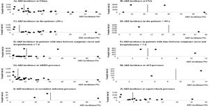 To identify possible factors associated with a higher AKI incidence, the estimated mean and 95% CI of AKI incidence in the patients with age ≤60 years and those with median or mean of time between symptom onset and hospitalization>7 days also determined. In addition, it was assessed the correlation between the incidence rates of AKI and the other complications (ARDS, ACI, secondary infection and sepsis/shock).