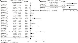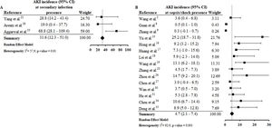 AKI estimate incidence in patients with secondary infection was 31.6% (CI 12.3–51.0%) and among those sepsis/shock was 4.7% (CI 2.1–7.4%) (S7 File). In the correlation tests, the incidence of these complications was also directly proportional to the AKI incidence (S9 File). Among selected studies, the rates of secondary infection and sepsis/shock were between 2.8%30 and 75%33 and between 0.3%9 and 65%,34 respectively. These complications result in hemodynamic instability, contributing to the increased need for RRT and the mortality rate among patients.37–40