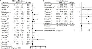 The estimated proportion of RRT need was 3.2% (CI 1.1–5.4%) and the estimated incidence of mortality was 50.4% (CI 17.0–83.9%) (S12). Continuous RRT (CRRT) was the predominant dialysis technique reported by studies. Hu et al.31 reports that 22.3% of patients studied required CRRT and, among those that required ICU admission the CRRT rate was 26.7%. The rate of death in AKI was between 35.7%21 and 100%,19,35 and the mortality rate was higher among patients who required CRRT.26,34