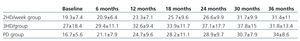 The progression of the glomerular filtration rate in the three groups of patients is displayed in Table 3. From the control in month six onwards, there were no statistically significant differences between the 2HD/week and PD groups. In the 3HD/week group, the glomerular filtration rate continued to display statistically significant differences with respect to the other two groups until the control at month 24.
