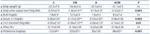 The differences in renal function parameters and body weights were calculated by subtracting the baseline values from the 6th day values. These delta (¿) values were also compared among the groups (Table 2). The absolute change value of serum Cr was found to be the highest in CM group. Absolute changes of daily urine output and CrCl in ACM group were significantly lower than those in CM group (p<0.05) (see Figure 1). Besides, proteinuria increased significantly in CM group compared with ACM group (p<0.05). Additionally, serum cystatin-C levels on day 6 were significantly lower in ACM group compared with CM group (p<0.05) (Table 3).
