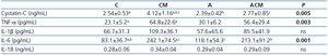 Among four inflammatory markers, all were found to be highest in CM group but only serum TNF-α and IL-6 (p: 0.001) levels were significantly different between the groups. The differences in serum TNF-α and IL-6 levels were significant between C and CM groups. However, the difference between the groups CM and ACM were not statistically significant in subgroup analysis (Table 3). Serum IL-1β and IL-18 levels seemed to be slightly elevated in CM group, but the difference did not reach statistical significance.
