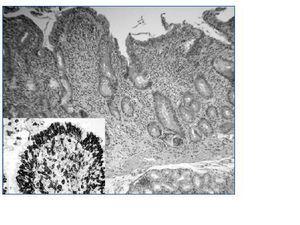 Se realizaron otras pruebas: coprocultivos y detección de toxinas de Clostridium difficile negativos. Serologías de HIV, hepatitis B y C negativas. Niveles de TSH, cortisol, ACTH y aldosterona normales, también el péptido intestinal vasoactivo y las catecolaminas en orina de 24 horas. PTH elevada (113 pg/ml) y vitamina D disminuida (8 ng/ml). Vitamina B12 y ácido fólico normales. En las pruebas de imagen (ecografía y TAC abdominal) no se detectó patología. El EMG-ENG no mostró alteraciones. La colonoscopia era normal hasta ángulo hepático. En la gastroscopia la mucosa gástrica era normal, destacando la presencia de una evidente atrofia de la mucosa duodenal de la que se tomaron biopsias. Los hallazgos anatomopatológicos se describen en el pie de la figura 1. Los anticuerpos antitransglutaminasa y antigliadina IgA resultaron positivos (> 100 U/ml y 120 U/ml respectivamente).