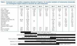 Se inició terapia intensiva con fluidos parenterales y reposición electrolítica. La tabla I detalla el tratamiento instaurado. Durante todo el ingreso mantuvo volúmenes de diuresis adecuadas. No se registraron nuevos episodios de tetania y la debilidad muscular se recuperó paulatinamente. El sexto día de ingreso las alteraciones del ECG habían desaparecido. Tanto el potasio como el resto de alteraciones electrolíticas y de la hemostasia se fueron normalizado progresivamente.