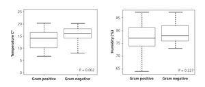 We found that the average daily temperature on the days when peritoneal Gram-negative infections occurred (15.46±3.71° C) was higher than in the case of Gram-positive ones (13.61±3.89° C) (P.022) Mean humidity was also slightly higher (78.76±4.40 vs. 77.5±3.69%), without being significant (Figure 2)