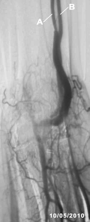 The fistulography (Figure 2) confirmed the ultrasound findings, a haemodynamically significant (80%) stenosis at 10cm from the arteriovenous fistula and another smaller one in the proximal third of the cephalic vein. Percutaneous angioplasty was performed on the 2 stenoses with good angiographic results. The identified collateral vessel was not treated in any way.