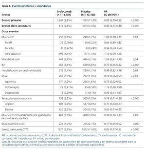 Los beneficios de evolocumab se objetivaron en eventos no fatales con una reducción de riesgo absoluta de ictus del 0,4%, de infarto de miocardio del 1,2% o de revascularización del 1,5%. No hubo diferencias ni en mortalidad cardiovascular ni en mortalidad total entre los 2 grupos (tabla 1).