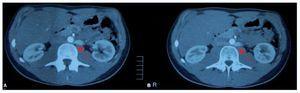Figura 1. Imágenes de angio-TC. A) Se visualiza vena renal izquierda que se afila en su paso entre aorta y columna en su camino hacia la cava inferior. B) Se observa el tránsito de una vena renal izquierda de calibre aumentado, con trayecto descendente, que pasa por detrás de la aorta.