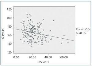 Figure 2. Bivariate correlation between pulse pressure calculated by the 24-hour ABPM and 25 hydroxyvitamin D levels