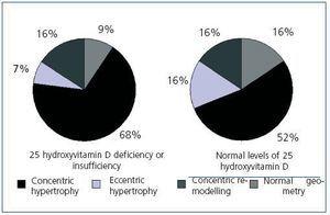 Upon analyzing the echocardiogram results, we found no relation between 25(OH)D levels and left ventricular mass index (Figure 3): 150 g/m2 (95% CI, 133-166) for patients with very low levels, 160 g/m2 (95% CI, 150-171) for patients with low levels, and 152 g/m2 (95% CI, 135-169) for patients with normal levels (p = 0.474). 74.5% of patients with low or very low 25(OH)D levels and 68.8% of patients with adequate vitamin D levels had criteria for left ventricular hypertrophy (not significant, p = 0.482). However, figure 4 shows that patients with 25 vitamin D deficiency or insufficiency show a greater tendency for concentric hypertrophy than patients with normal levels, while these show a higher percentage of normal geometry or eccentric hypertrophy. We observed no significant differences in systolic or diastolic function according to vitamin D levels.