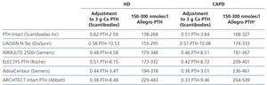 The first KDOQI guidelines established reference ranges for PTH in different CKD stages without specifying the PTH method, since they did not consider that there could be a significant variability between methods, let alone possible differences between dialysis techniques. Despite their limitations, especially in diagnosing low turnover situations21, the S.E.N. guidelines continue to recommend similar values, although they require values between 100 and 500nmoles/l22, when considering variability between methods. Additionally, and in order to partially alleviate this problem, the S.E.N. has proposed adjustment formulas that would allow homogenisation of PTH values independently of the method used19 after carrying out a variability study on HD-prevalent stage 5 CKD patients. To date, we have used these algorithms to adjust the results of PTH in patients on dialysis without considering the dialysis technique.
