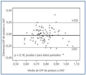 Los perfiles de saturación de potasio fueron muy similares en las PEP al 2,27 y al 3,86% (figura 1). La concordancia fue buena, sin sesgos sistemáticos entre ambas pruebas, a los 60 (p = 0,09), 90 (p = 0,71), 120 (p = 0,17) y 240 minutos (figura 2).