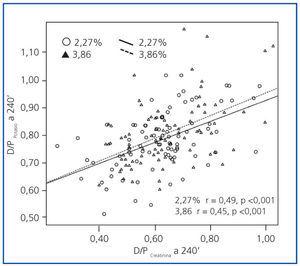 Las características principales de la población estudiada se resumen en la tabla 1. Las cargas peritoneales diarias de glucosa en el momento de las PEP eran de 87,2 ± 47,0 g (27,2-233,7; 2,27%) y 90,4 ± 45,9 g (21,2-236,0; (3,86%; p = 0,46). En cuanto a los resultados generales de las PEP, los perfiles de D/PCr fueron muy similares en las pruebas al 2,27 y al 3,86% (datos no expuestos). La población estudiada incluía a 17 bajos transportadores (18,9%), a 63 medios transportadores (70,0%) y a 10 altos transportadores (11,1%). Los valores medios de UF durante las PEP fueron 131,4 ± 256,7 ml (−480 a −600; 2,27%) y 542,0 ± 344,5 ml (−150 a 1.300; 3,86%). Veintiséis pacientes (28,9%) cumplieron el criterio dignóstico de fallo de UF. Los niveles plasmáticos de potasio fueron 4,74 ± 0,72 mM/l (2,8-6,1; 2,27%) y 4,73 ± 0,62 mM/l (3,5-6,1; 3,86%; p =0,70). Los valores medios de glucemia fueron 111,7 ± 48,6 mg/dl (52-269) y 112,5 ± 48,5 mg/dl (66-318), respectivamente (p = 0,85).