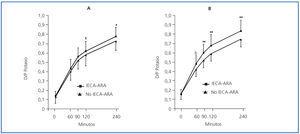 En la tabla 2 se exponen las correlaciones univariantes entre el cociente D/PK-240’ por un lado y las diferentes variables demográficas, clínicas y bioquímicas escrutadas, por otro. Era patente una clara tendencia a valores más altos de D/P de potasio en los pacientes tratados con IECA-ARA (figura 4), especialmente durante la PEP al 3,86% (figura 4b). Los niveles medios de potasio en plasma eran de 4,84 ± 0,69 mM/l (2,8-5,8) (IECA-ARA) frente a 4,64 ± 0,64 mM/l (3,1, 6,1) (no IECAARA) durante la PEP al 2,27% (p = 0,18), y 4,89 ± 0,68 (3,5-6,1) y 4,61 ± 0,65 mM/l (3,6-5,8), respectivamente, durante la PEP al 3,86% (p = 0,06).