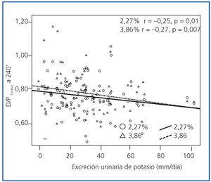 En el análisis de regresión múltiple (tabla 3) se identificó la categoría general de transporte peritoneal (estimada por D/PCr-240’) como el predictor más consistente del cociente D/PK-240’. Los cocientes D/D0 de glucosa y D/P de urea a 240 minutos generaban modelos menos consistentes que el D/PCr-240’ en ambas PEP. Por otra parte, el tratamiento con IECA-ARA fue también un potente predictor del D/PK-240’, pero sólo en la PEP al 3,86%, mientras que en la PEP al 2,27% se observaba una tendencia similar, pero no significativa. Además, tanto el FG (tabla 2) como la excreción urinaria de potasio (figura 5) tuvieron una correlación univariante inversa con la variable principal. El FG se mantenía como predictor independiente del cociente D/PK-240’ (B = −0,005 [IC 95% −0,009 a 0,000], p = 0,036 PEP al 2,27%; B = −0,005 [−0,010 a 0,000], p = 0,038 PEP al 3,86%) sólo si no se incluía el potasio urinario en el modelo de regresión, pero esta última variable tuvo una asociación mucho más estable con la variable dependiente principal (tabla 3).