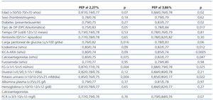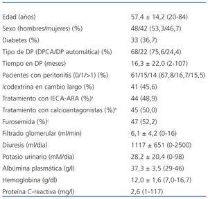 El FG se computó como la media de los aclaramientos renales de urea y creatinina. El transporte peritoneal general (cociente D/P de creatinina a 240 minutos D/PCr-240’) se categorizó de acuerdo a los resultados de la PEP al 2,27%. Los cocientes D/P de potasio y creatinina se calcularon como el cociente entre las concentraciones en efluente en cada punto de la PEP y las concentraciones en plasma en el punto medio de la prueba. El descenso de sodio se computó como DNa-60’ – DNaNa-0’. El valor D/D0 de glucosa se calculó como el cociente entre las concentraciones de glucosa en efluente en cada Na-0’ punto de muestreo y la concentración en el punto 0 minutos. La UF durante la PEP se calculó por la diferencia de pesos de la bolsa antes de la infusión y tras el drenaje final. Se definió el fallo de UF por un valor de UF <400 ml durante la PEP al 3,86%.