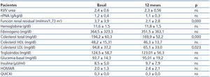 En la tabla 2 se reflejan los parámetros de diálisis, datos analíticos e índices de resistencia a la insulina (HOMAIR y QUICKI), en situación basal y a los 12 meses de seguimiento. Solo se observaron diferencias estadísticamente significativas en la función renal residual, colesterol total y colesterol LDL.