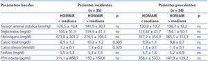 Cuando se clasificaron los pacientes en función de la mediana del HOMAIR basal (HOMAIR, 1,7, rango: 6,29), observamos que los pacientes incidentes con el HOMAIR más elevado tenían niveles de calcio total y calcio iónico significativamente más altos, comparados con los que presentaban valores de HOMAIR más bajos. En los pacientes prevalentes no se encontraron diferencias significativas (tabla 3). Al distribuir los pacientes según la mediana de la insulinemia (7,0, rango: 2-25), los hallazgos fueron similares a los anteriores.