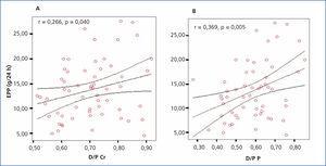 Aplicando la prueba de asociación de Pearson, se encontró una correlación positiva significativa (r = 0,266; p = 0,040) entre el D/P de creatinina y la EPP. Aplicando la misma prueba de asociación, pero ahora entre el D/P de fósforo y la EPP, encontramos una mayor y significativa fuerza de asociación (r = 0,369; p = 0,005) (figura 2 A y B).