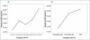Al comparar la EPP entre grupos de acuerdo al transporte de creatinina, no se encontraron diferencias significativas; sin embargo, se observó una tendencia al alza en los valores de EPP en los grupos de transporte para creatinina más rápidos. Por otra parte, sí se encontraron diferencias significativas (p = 0,042) al comparar la EPP entre categorías de transporte de fósforo, siendo mayor la EPP en los grupos con transporte alto (figura 3 A y B).