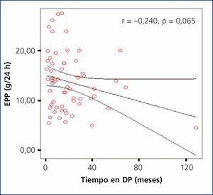 Figura 4. Correlación entre tiempo en diálisis y la excreción peritoneal de proteínas