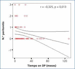 Se encontró una correlación negativa significativa entre el tiempo total de estancia en diálisis y el número de episodios de peritonitis (r = –0,325; p = 0,013) (figura 5).