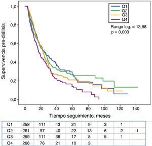 Patients in the upper quartile of serum K showed a more rapid progression of CKD, and a higher frequency of onset of dialysis than in the rest of the patients although this difference was not statistically significant. However, both the percentage of deaths in pre-dialysis stage and the hospital admission rate were higher in the lower quartile of serum K.