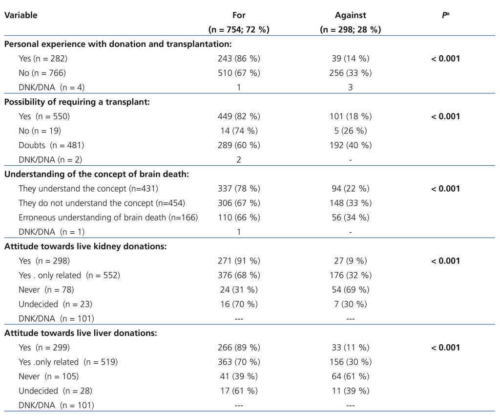 Having had personal experience with donation and transplantation (knowing friends and/or family members who were donors or who have received transplants) favours a positive attitude for organ donation, compared with those who did not have a personal experience (86% compared to 67%, P<.001) (Table 3). Those who were considering the possibility of requiring a transplant in the future if it were necessary were more for a deceased donor donation than those who were not considering it (82% compared to 60%), p<.001). Those surveyed who understood the concept of brain death were more for deceased donor donations than those whose idea was erroneous or who did not understand the concept (78% compared to 66%, P<.001), although it is necessary to highlight that only 41% knew it or accepted it as the death of the individual. There was also a close relationship between the attitude towards deceased donor donation and the attitude towards live kidney donor donation (91% compared to 31%, P<.001) and a live liver donation (89% compared to 39%, P<.001).