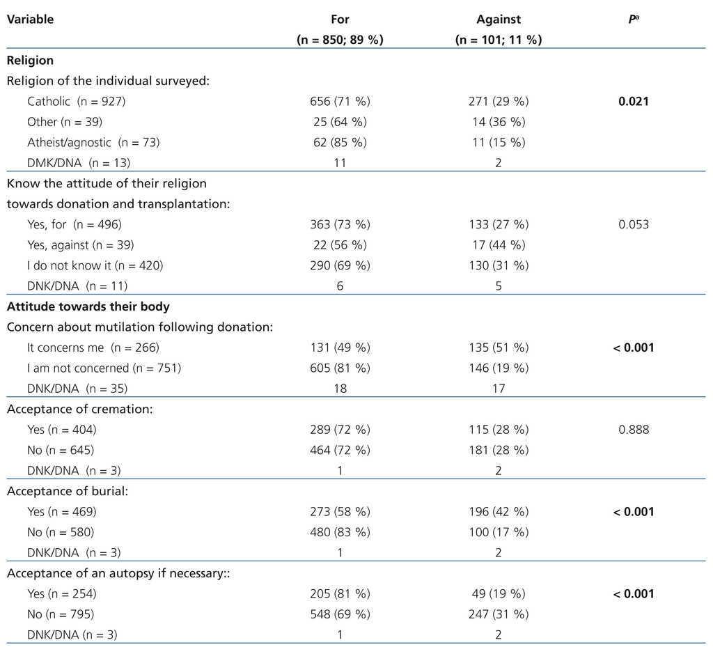 Atheists and agnostics surveyed were those most in favour of this type of donation (85%), followed by Catholics (71%) (p=.021) (Table 5). We did not observe that being aware of the positive attitude of the church promoted a more positive attitude amongst its members.