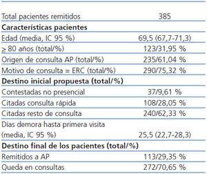 Se han recibido durante estos seis meses 385 propuestas para la consulta de Nefrología. En la tabla 1 se muestran las principales características de los pacientes remitidos, el destino inicial dado a las propuestas, la demora hasta la primera visita y el destino final de los pacientes. Como se puede apreciar, la mayoría de las propuestas provienen de Atención Primaria, y el motivo de consulta es ERC (bien estable, bien tras haberse detectado un deterioro de la función renal) en tres cuartas partes de los casos.