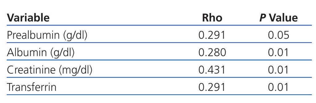 - Of the nutritional markers, prealbumin (Pearson, P<.05), albumin (Pearson, P<.05), total proteins (Pearson, P<.05), creatinine (Pearson, P<.01) and transferrin (Pearson, P<.01) relate to total and relative lean mass (Pearson, P<.05) (Table 4).