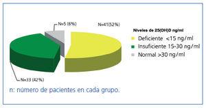 Los niveles de 25(OH)D en los 79 pacientes seguían la siguiente distribución: 41 pacientes (52%) tenían niveles deficientes (menores de 15 ng/ml), 33 (42%), niveles insuficientes (entre 15 y 30 ng/ml), y en sólo 5 pacientes (6%), los niveles fueron normales (mayores de 30 ng/ml) (figura 1).