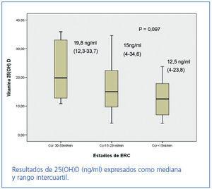 Los niveles de 25(OH)D, en los estadios 3, 4 y 5 de ERC, expresados en mediana y rango intercuartílico, fueron: estadio 3: 19,8 ng/ml (12,3-33,7), estadio 4: 15 ng/ml (4-34,6) y estadio 5: 12,5 ng/ml (4-23,8). Observamos niveles disminuidos en todos los estadios de ERC, con una tendencia a disminuir según avanza el grado de ERC (p = 0,097) (figura 2).