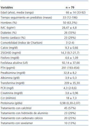 Recibieron tratamiento con quelantes del fósforo (hidróxido de aluminio, 23 pacientes [29%], sevelamer, 10 pacientes [13%] y carbonato cálcico, 20[25%]). Recibieron calcitriol oral como única forma de vitamina D 45 pacientes (57%).