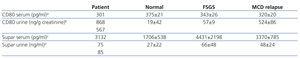 Serum and urinary CD80 and suPAR levels (Table 1). The patient showed marked elevated CD80 urinary levels similar to those seen in MCD and urinary suPAR levels were also elevated when compared to controls. Serum CD80 was within the range observed in normal controls and in patients with MCD and FSGS. Serum suPAR was below the mean reported in patients with FSGS.