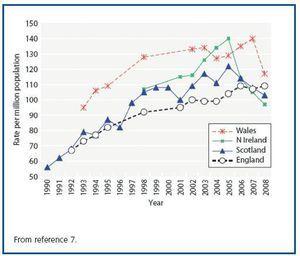 Figure 1. RRT incidence rates in the countries of the United Kingdom 1990-2008