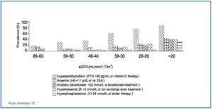 Moranne et al. have surveyed the prevalence of complications of CKD15 (figure 3). It is apparent that complications (which are quite sensitively defined) are infrequent in the early stages of CKD and only become obvious when the GFR is <30 mL/min. Such patients are just as easily identified by their abnormal serum creatinine interpreted in context as by eGFR.