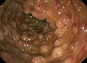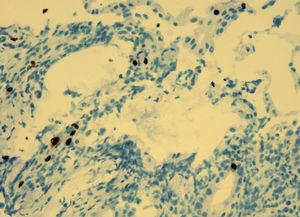 Durante el ingreso, la paciente desarrolló fiebre, dolor abdominal, vómitos y deposiciones diarreicas. Se realizaron coprocultivos, estudio de parásitos, determinación de toxina para Clostridium difficile y antigenemia para citomegalovirus (CMV) en dos ocasiones, que resultaron negativas. Se realizó TC abdominal (figura 1) en la que se observó engrosamiento de la pared del colon con oclusión de la luz desde el ciego hasta la unión recto-sigmoidea compatible con pancolitis difusa. Se solicitó fibrocolonoscopia (figura 2) en la que se objetivó una mucosa edematosa con múltiples lesiones nodulares blandas compatibles con neumatosis coli. En la biopsia de colon se detectaron inclusiones víricas que se confirmaron para CMV por inmunohistoquímica (figura 3). La tercera determinación de antigenemia para CMV fue positiva y el diagnóstico definitivo fue de colitis por CMV.