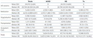 The costs of the lower financial impact sections (transportation and outpatient care) were also greater for HD patients. The only clear difference between transplant and ACKD patients was in the medication section, where the transplant patient costs were double the ACKD patient costs.