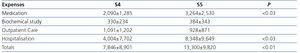 The results of this study are fundamentally descriptive, and as such, we have exclusively used basic statistics tests. Given that the cost values were extreme in some patients, there was an asymmetric distribution towards high values. This is highlighted because the mean was higher than the median, particularly for the expenses of hospitalisation and consultation, not used in many cases. For these types of data with many extreme values, the median must be considered to be a stronger comparison parameter; however, the arithmetic mean is considered to be more informative of the total cost for decision-making about health policies20-24. Finally, we presented the results in both formats, mean ± standard deviation (SD) and median (interquartile range [IR]). The statistical analyses were carried out with the SPSS 17.0 software for Windows (SPSS Inc, Chicago, ILL).
